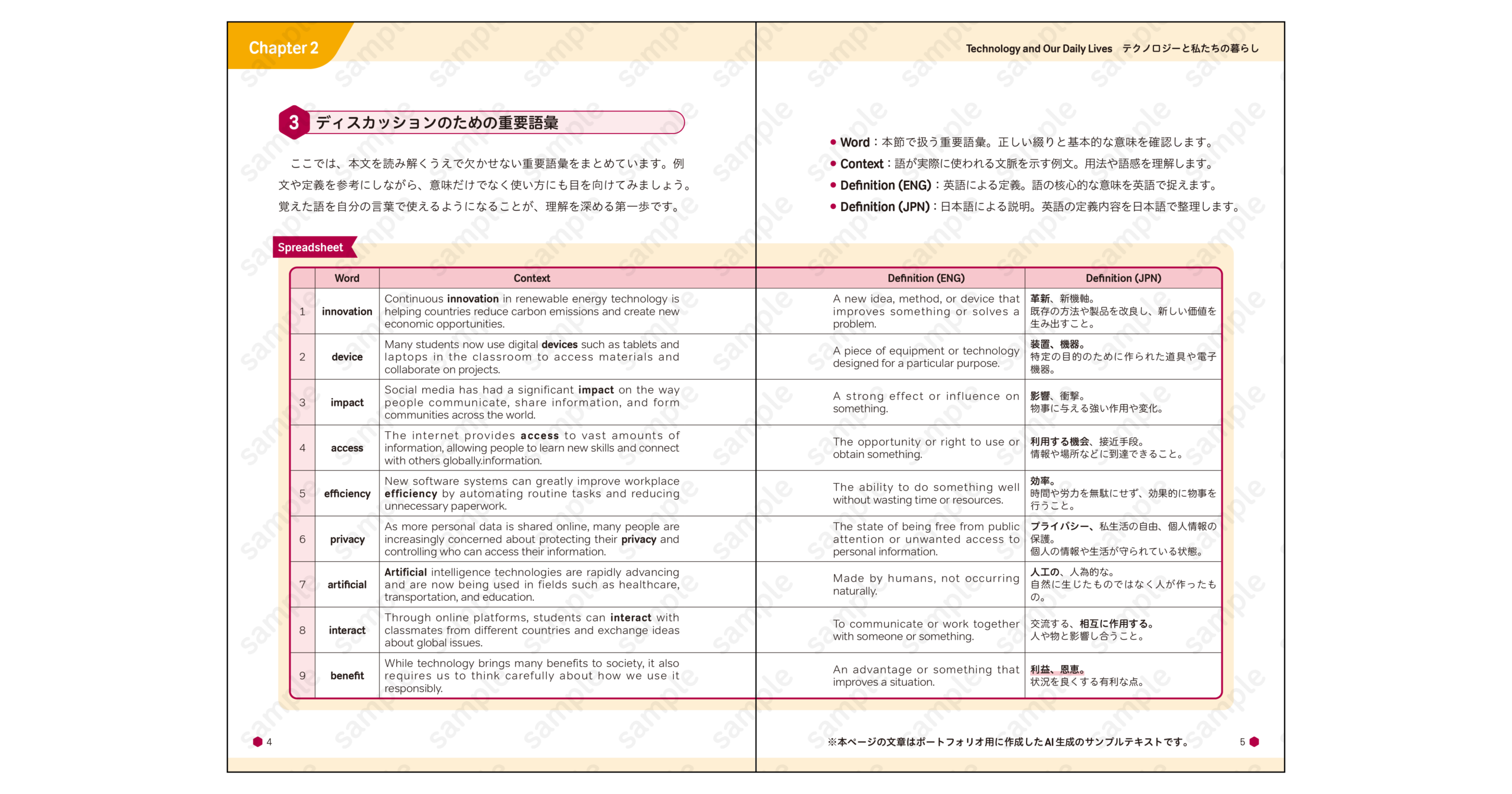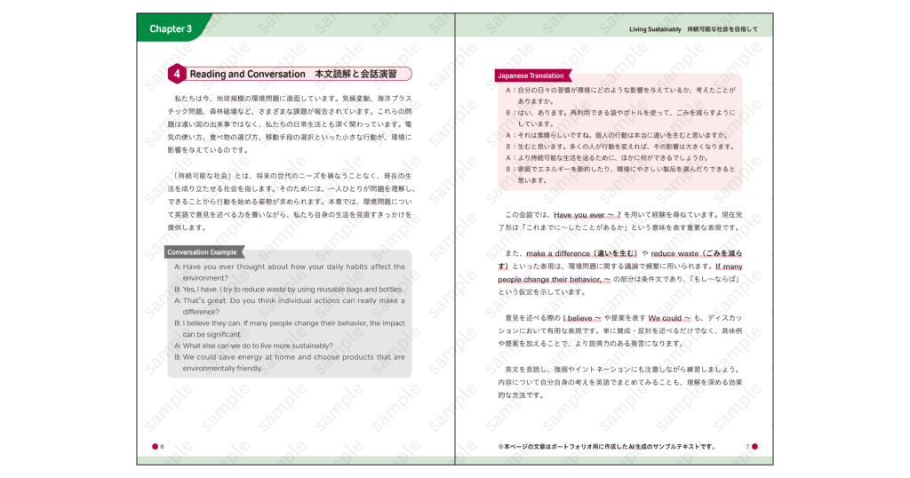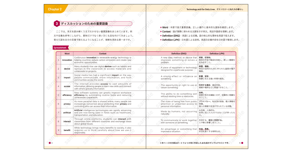 本文では、会話例・語彙表・解説ページなど各種フォーマットの設計を行いました。出版前案件のため内容はダミー化していますが、実制作を想定した構成となっています。